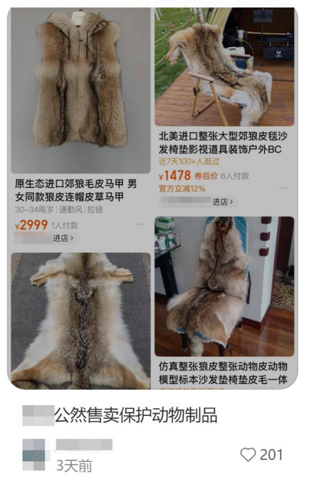 “震惊!电商平台公然允许售卖保护动物制品?!”近日,在社交平台上,有多名网友发帖称,在电商平台搜“狼皮”,结果“满屏都是郊狼皮、狼皮制品在公开售卖,马甲、皮毯、半成品皮料一应俱全。”。