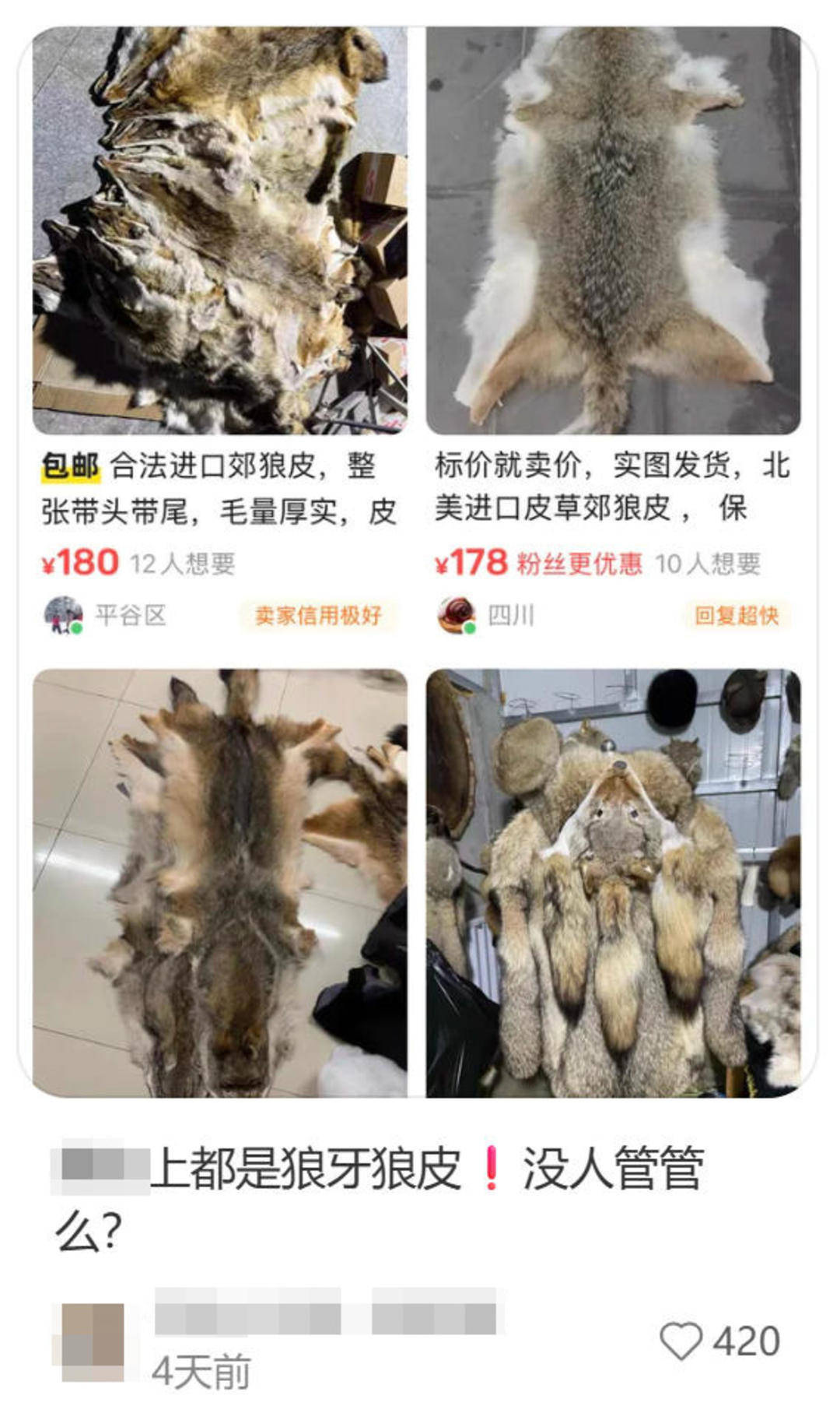 网友质疑:狼皮可以网上售卖,是否合法?