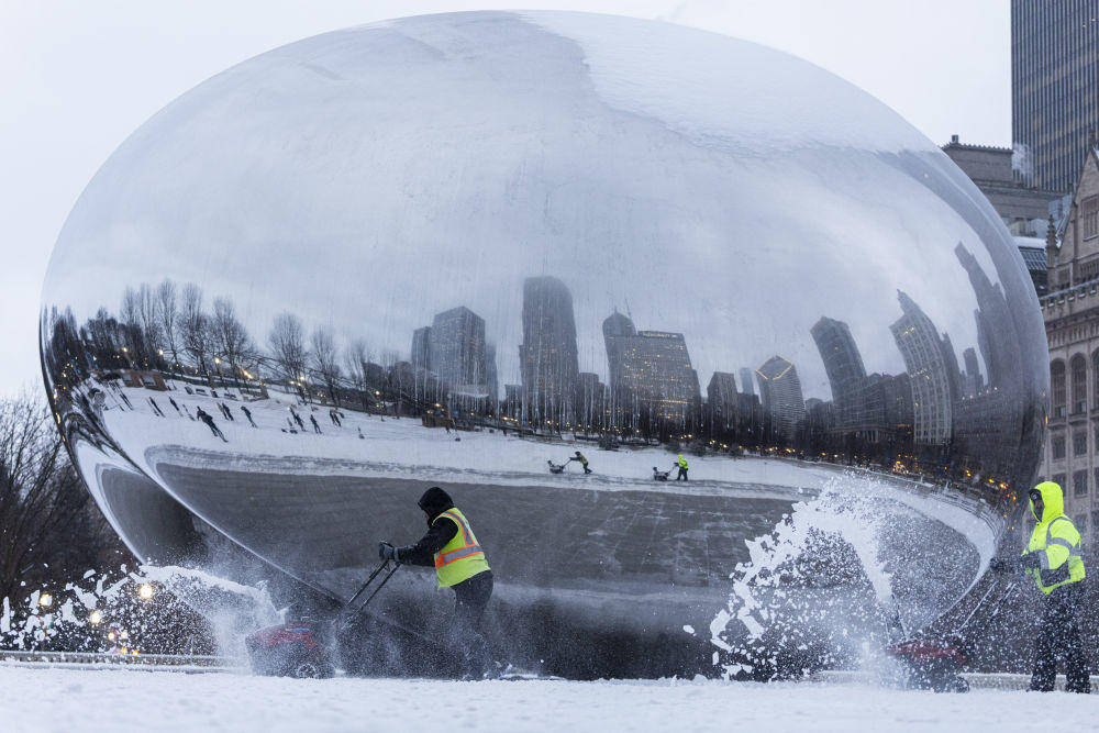 2025年2月12日,工人在美国芝加哥市中心清扫积雪。芝加哥当日遭遇冬季风暴,降雪过后气温大幅下降。新华社发(文森特·约翰逊摄)