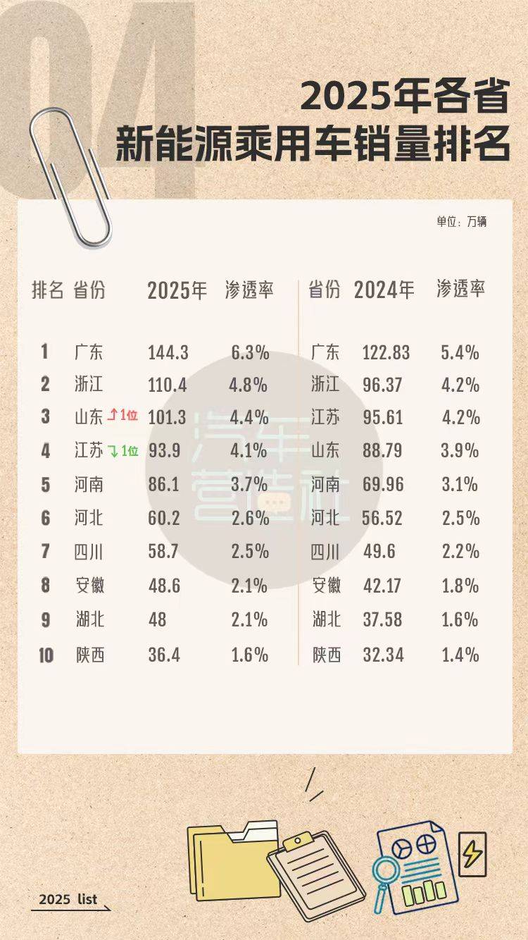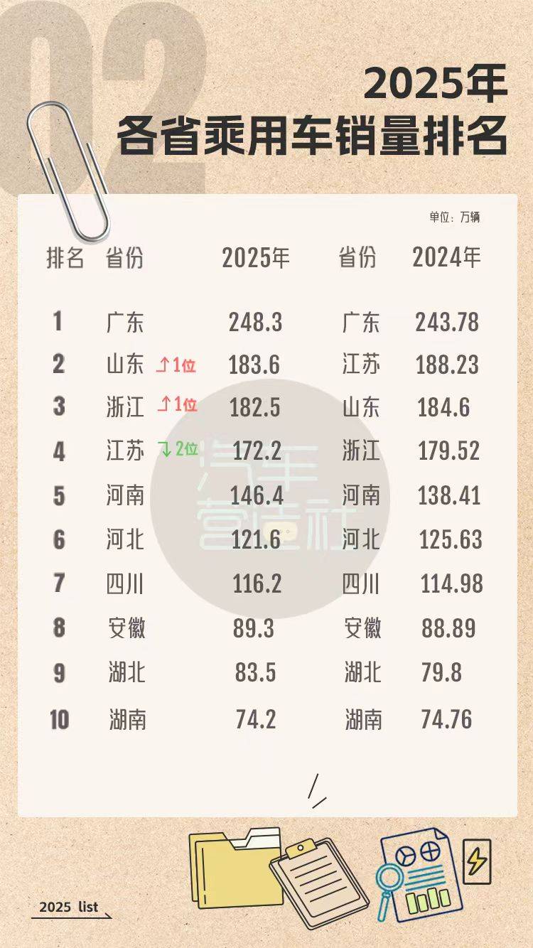 2025年各省乘用车终端销量前十出炉,广东、山东、浙江荣登销量前三,江苏从2024年的第2名降至第4名。