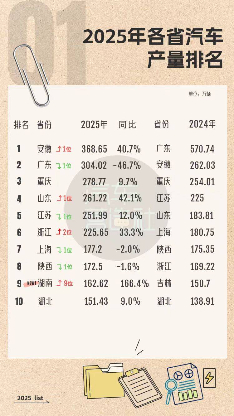 2025年上半年,安徽就展现逆袭之势,超过广东成为汽车产量的“榜一”大哥。随着国家统计局全年数据出炉,这一新身份随即坐实,安徽以368.65万辆的成绩成为2025年汽车产量“第一省”。