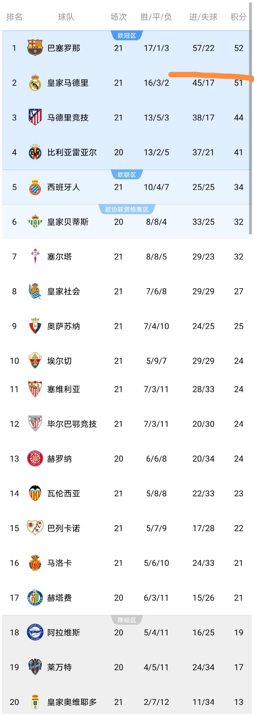 可以看到巴萨击败皇家奥维耶多队之后,积分上涨到了52分,又从皇马手中夺回了榜首的宝座,而皇家奥维耶多输球之后继续垫底。马竞取得胜利之后积分上涨到了44分,反超比利亚雷亚尔队升至了第3,而马略卡输球之后积21分排名第16。塞尔塔输球之后积32分排名第7,无缘反超西班牙人升至第5,这显然是天助西班牙人,而皇家社会队赢球之后积27分排名第8,逼近前六,也就是逼近欧战席位区了。