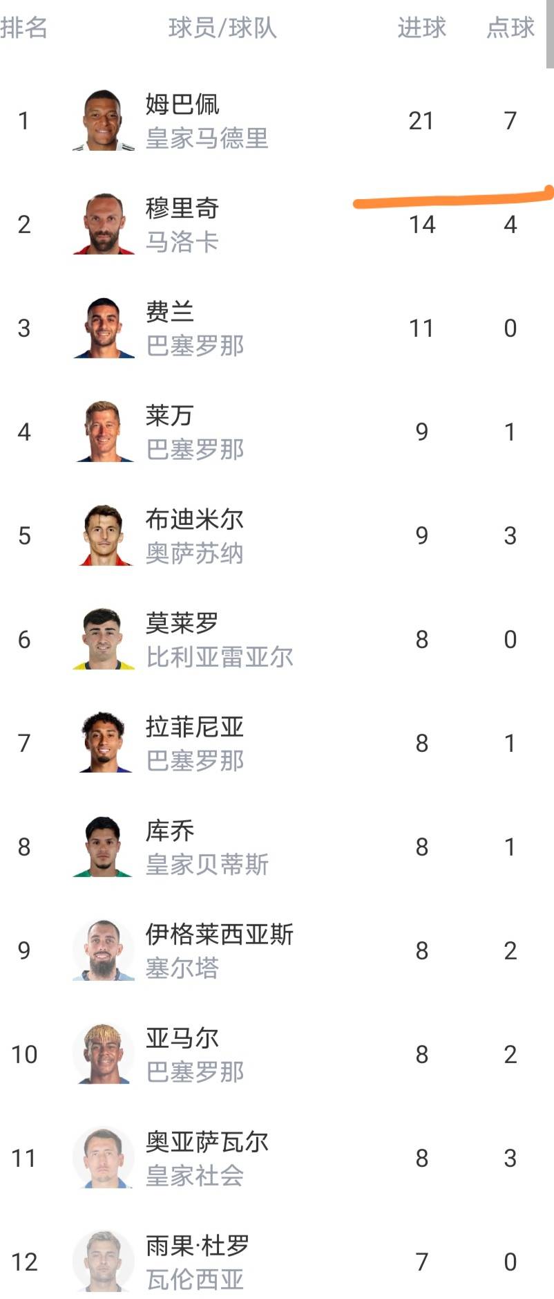 射手榜姆巴佩依然21球领跑,费兰11球,穆里奇14球,莱万9球。