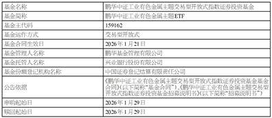 鹏华中证工业有色金属主题交易型开放式指数证券投资基金将于2026年1月29日在深圳证券交易所上市,上市交易公告书全文于2026年1月26日在本公司网站(www.phfund.com.cn)和中国证监会基金电子披露网站(http://eid.csrc.gov.cn/fund)披露,供投资者查阅。如有疑问可拨打本公司客服电话(400-6788-533)咨询。