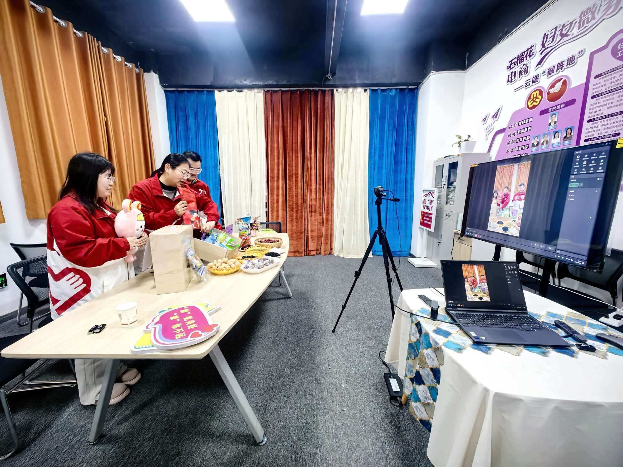 大学生西部计划志愿者们化身主播,向全国网友推介尉犁红枣、罗布麻茶、西梅干等特色农产品 (许梦琪 摄)