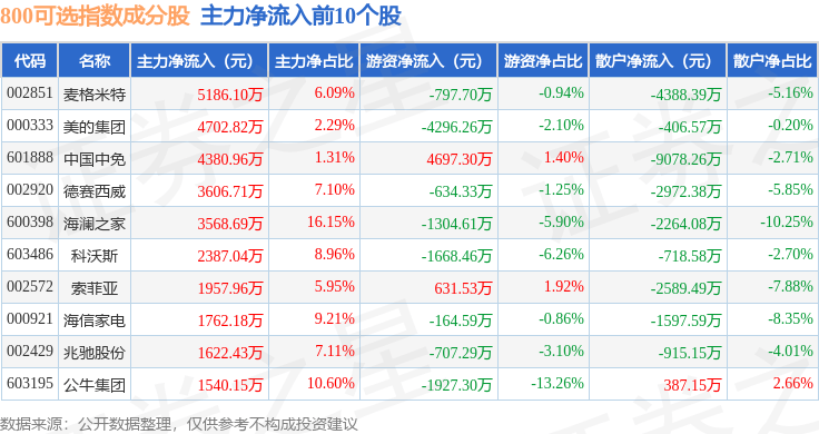 资金流向方面,800可选(000931)指数成份股当日主力资金净流出合计29.43亿元,游资资金净流入合计1.8亿元,散户资金净流入合计27.63亿元。成份股资金流向详情见下表: