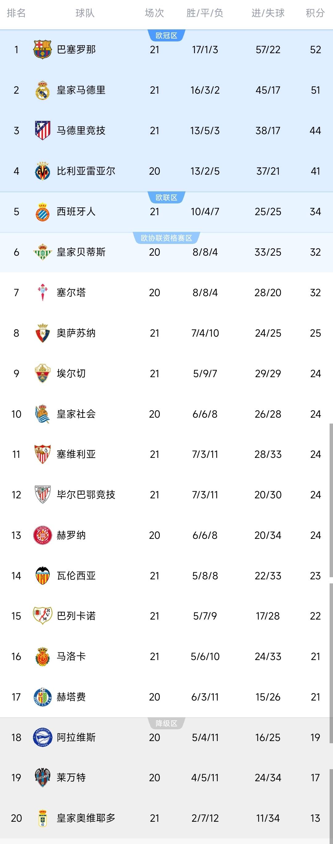 截止目前西甲最新积分榜如下,巴萨夺回头名,领先皇马1分,两队差距相当微妙,争冠已经进入白热化阶段,关键在于谁能顶住压力。