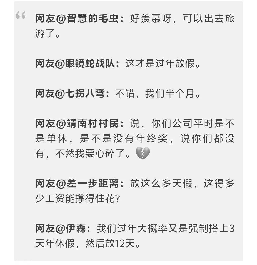 评论区网友表示,真叫人羡慕!这么长的假期,是错峰出游的好时机。