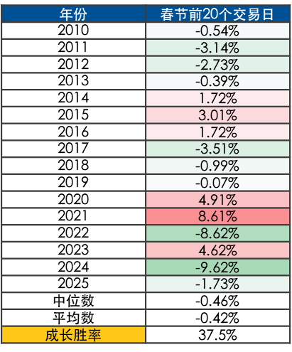 胜率维度,日历效应进一步印证了当前价值风格胜率更高。2010至2025年,春节前20个交易日,价值风格占优胜率62.5%。