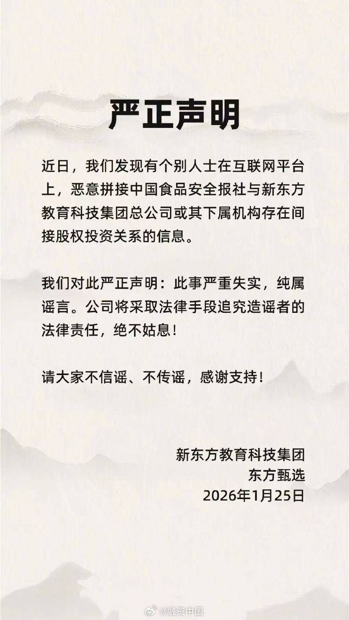 1月26日,俞敏洪发布声明:近日,我们发现有个别人士在互联网平台上,恶意拼接中国食品安全报社与新东方教育科技集团总公司或其下属机构存在间接股权投资关系的信息。