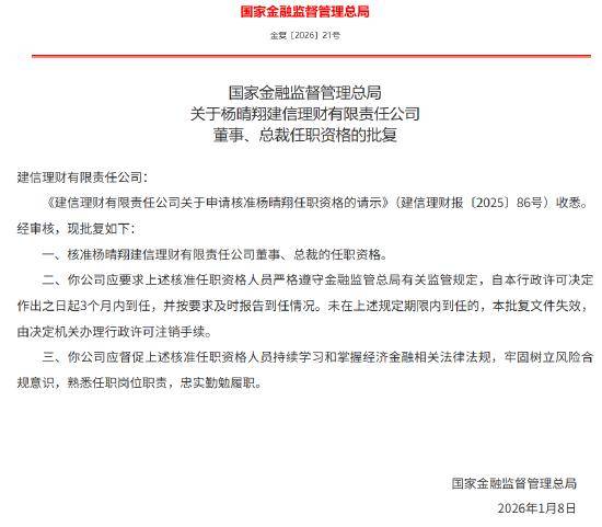 国家金融监督管理总局近日发布任职资格批复,正式核准杨晴翔担任建信理财有限责任公司董事、总裁的任职资格。此次批复的落地,标志着建信理财在核心管理团队配置上进一步完善,为公司后续业务稳健开展提供了重要的人事保障。