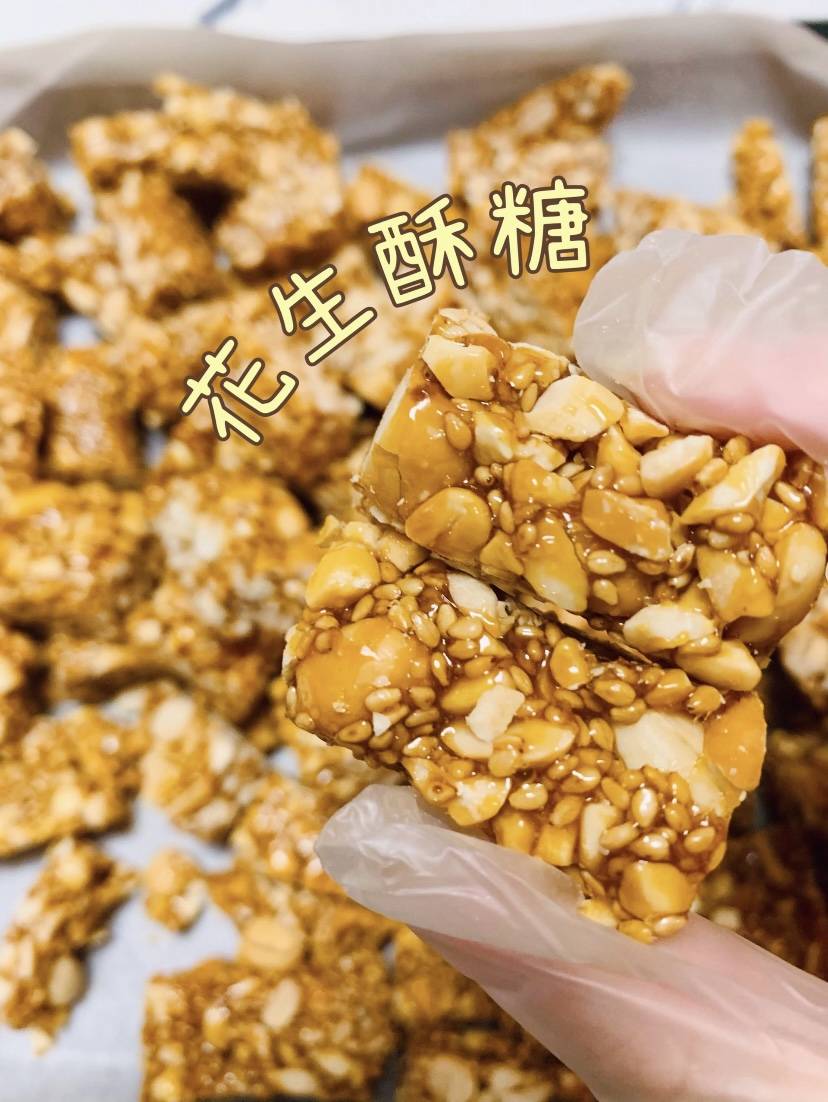 准备食材熟花生仁 200g、白砂糖 100g、麦芽糖 80g、清水 30g、食用油 10g、熟白芝麻 10g(可选)详细制作步骤+关键技巧1. 处理花生仁,去衣更香!熟花生仁放进保鲜袋里,用擀面杖轻轻擀碎,不用太细,保留一些颗粒感,吃起来更有嚼劲。小技巧:花生仁一定要用熟的!生花生仁做出来会有生腥味,直接用炒好的或者烤熟的都可以。擀碎后挑掉花生衣,不仅颜色更漂亮,口感也更清爽,不会有涩味。2. 熬糖是灵魂,火候决定成败!锅里放入白砂糖、麦芽糖、清水和食用油,开小火加热,用铲子不停搅拌,直到糖完全融化。继续熬煮至糖浆变得浓稠,用筷子挑起能拉出细而脆的糖丝,或者滴一滴糖浆到凉水里,能立刻变硬脆不粘手,就说明熬好了。小技巧:熬糖全程必须小火,还要不停搅拌,防止糊锅发苦!没有麦芽糖可以用玉米糖浆代替,但麦芽糖能让酥糖更有韧性,不容易碎。判断火候是关键,糖浆没熬够会粘牙,熬过头了会发苦,新手可以用冷水测试法,百试百灵。3. 混合搅拌,动作要快准狠!立刻关火,把擀碎的花生仁和白芝麻倒进锅里,用铲子快速翻拌均匀,让每一粒花生都裹上糖浆。小技巧:这一步一定要快!糖浆降温后会迅速凝固,慢了就会结块拌不开。如果觉得太黏,可以用硅胶铲压拌,比用筷子更顺手。4. 整形切块,趁热操作!把拌好的花生糖糊倒进提前刷了油的模具里(或者铺了油纸的案板),用硅胶铲用力压实,压得越紧实,切块后越不容易散。小技巧:模具一定要刷油或者铺油纸,防粘效果一流!压实的时候可以用铲子反复按压,边角处也要填满,这样切出来的酥糖形状规整。5. 切块密封,锁住酥脆!等花生糖稍微降温,还有点温热的时候,赶紧用刀切成小块。完全冷却后会变得特别脆,再切容易碎掉。小技巧:切块要选温热不烫手的时候!凉透后切会崩得满地都是,别问我怎么知道的。切好的花生酥糖放进密封罐里保存,防止受潮变软,吃不完的可以放冰箱,口感更脆。