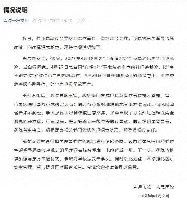 事件发生后,我院高度重视,积极协助完成尸检及医疗事故技术鉴定,省、市两级医疗事故技术鉴定认为:医方行心脏射频消融术有手术适应证,但风险沟通告知不到位、手术操作未尽到谨慎注意义务,术中出现了可以预见但难以完全避免的并发症,存在过失。鉴定结论为一级甲等医疗事故,医方承担主要责任。我院尊重事实,积极配合相关部门依法依规调查处理,并承担相应责任。