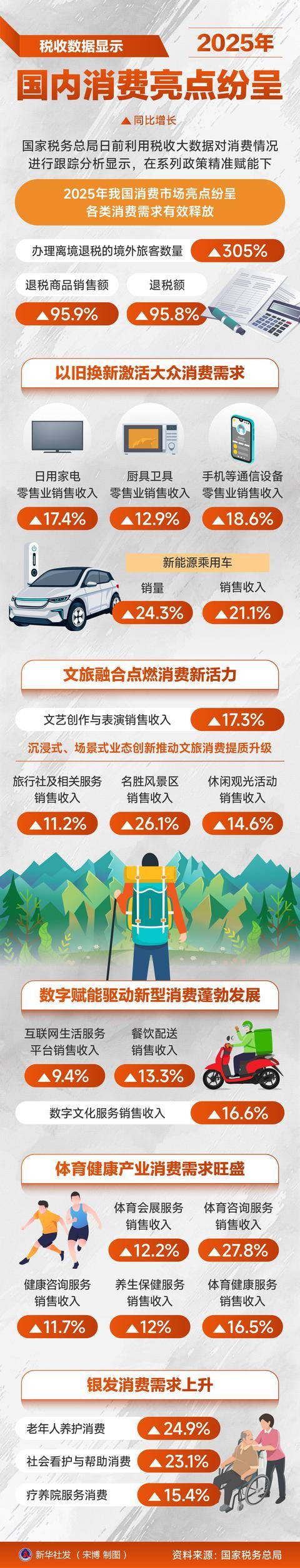 记者1月26日从国家税务总局获悉,国家税务总局日前利用税收大数据对消费情况进行跟踪分析显示,在系列政策精准赋能下,2025年我国消费市场亮点纷呈,各类消费需求有效释放。其中,办理离境退税的境外旅客数量同比增长305%,退税商品销售额同比增长95.9%,退税额同比增长95.8%。