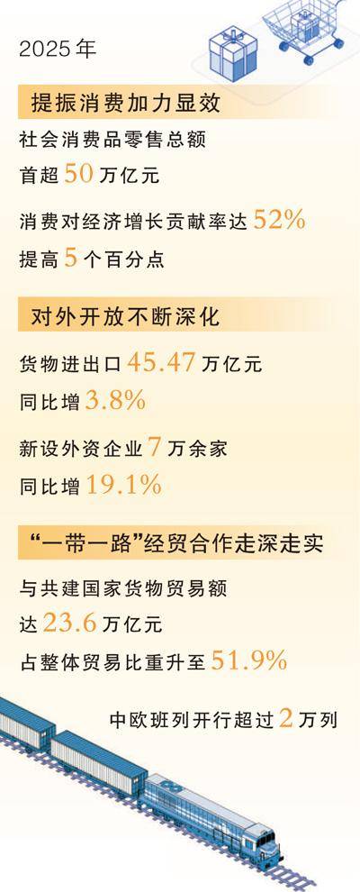 鄢东介绍,2025年,商务部坚持惠民生和促消费紧密结合,以“政策+活动”双轮驱动,打造“购在中国”品牌,释放消费活力,全年社会消费品零售总额首次突破50万亿元,达50.1万亿元,同比增长3.7%,消费对经济增长的贡献率提高5个百分点至52%。