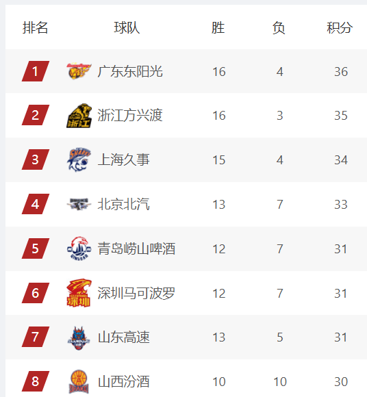 卫冕冠军广厦队,他们目前的战绩为16胜3负,排在积分榜第2名,而上海队则排在第三名,他们的战绩为15胜4负。目前,积分榜前三名的球队,已经与身后的球队逐渐拉开差距了。广东队和广厦队,他们已经领先北京队3个胜负场,而上海队也手握两个胜负场差距。尽管常规赛还剩下一大半赛程,不过,对于积分榜前四名的球队而言,任何一场胜利都是极为宝贵的。后面球队想要追上他们,恐怕也没有那么容易。