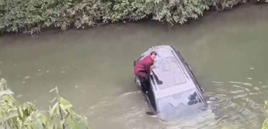 现场视频中,汽车车头已被河水淹没,大人焦急呼救,车内孩子被吓得大哭。