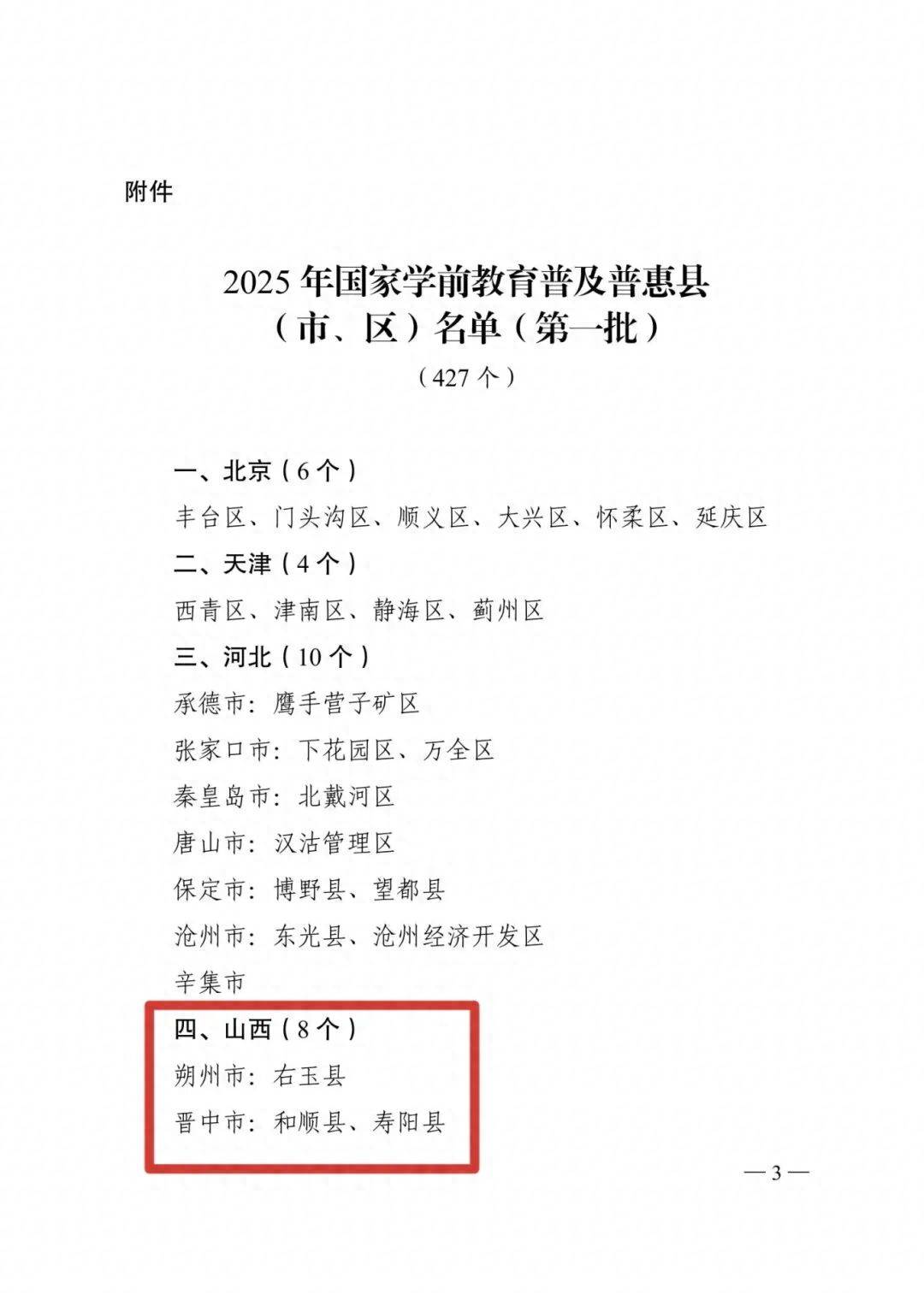 近日,教育部印发通知,公布2025年国家学前教育普及普惠县(市、区)名单。2025年第一批认定427个县(市、区)为国家学前教育普及普惠县。其中,天津、上海两个直辖市全域通过国家评估认定;山西8个市(县)通过国家评估认定。具体名单,一起来看——