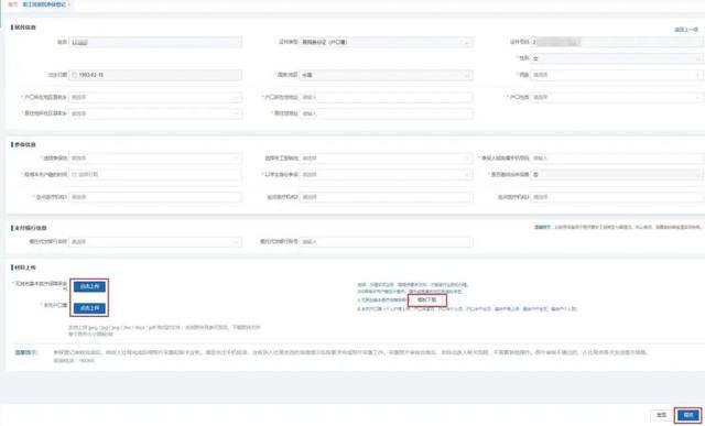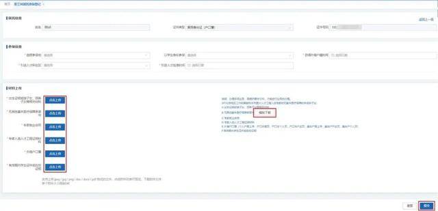 5.系统会根据参保人是新参保增员还是续保增员跳转至不同的登记信息录入页面,填写参保信息,*为必填项,点击【点击上传】按钮上传材料,上传支持jpeg/jpg/png/doc/docx/pdf格式的文件(注:部分场景附件需上传《无其他基本医疗保障承诺书》),点击【提交】按钮