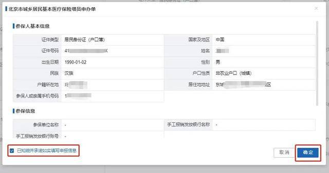 6.查看北京市城乡居民基本医疗保险增员申办单,勾选【已知晓并承诺如实填写申报信息】后点击【确定】按钮