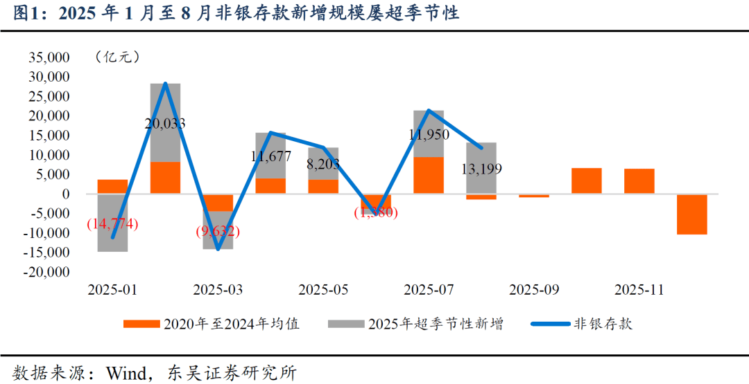 在2025年7月至8月非银存款超季节性增加3.03万亿的结构中,居民和非金融企业超季节性增加1.42万亿,若进一步拆解居民和企业的哪些存款发生变动,还需要结合其他存款性公司的资产负债表和信贷收支表做进一步拆解。