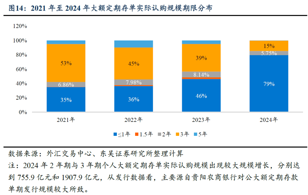 从外汇交易中心披露的大额存单实际认购规模的期限分布来看,在2021年至2024年期间,3年期大额存单一度成为主力发行期限,凸显出2021年货币政策进入“降准降息”周期之后,银行体系对稳定性更高的长期限负债的需求较强,其中2021年至2023年3年期大额存单发行比例持续处于高位,在2022年存款利率市场化调整机制建立之年,3年期大额存单实际认购比例达到44.57%,2023年这一比例尽管下降至38.51%,但依然是长期大额存单的主力期限。