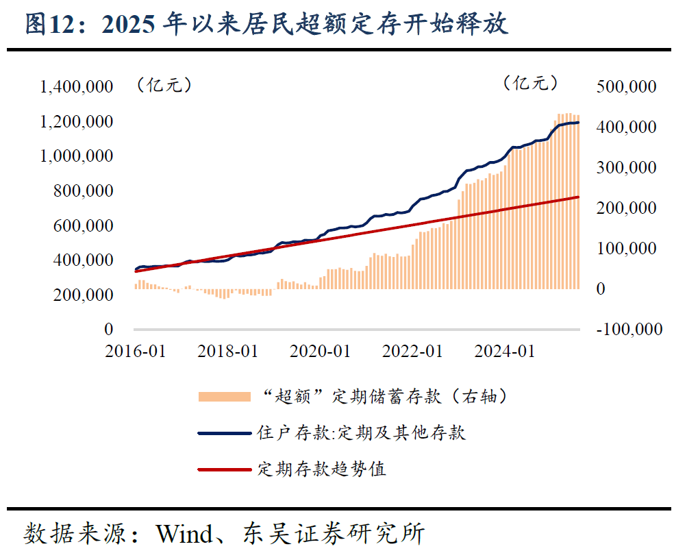 2025年至2026年还有多少定期存款“活化”潜力:居民和企业定期存款从2025年二季度开始进入到期高峰。(1)从2021年至2024年合计增加的66.54万亿元定期存款绝对额看,推测在2025年和2026年分别有22.28万亿元和9.4万亿定期存款到期,单就2025年而言,三季度和四季度分别有5.24万亿和1.66万亿定存到期;(2)从居民和非金融企业“超额”定期存款来看,2021年至2024年合计增加有66.54万亿元定期存款,在2025年和2026年大约分别有11.08万亿元和4.05万亿超额定期存款到期,2025年三季度和四季度分别有约2.13万亿和约2.81万亿超额定存到期。