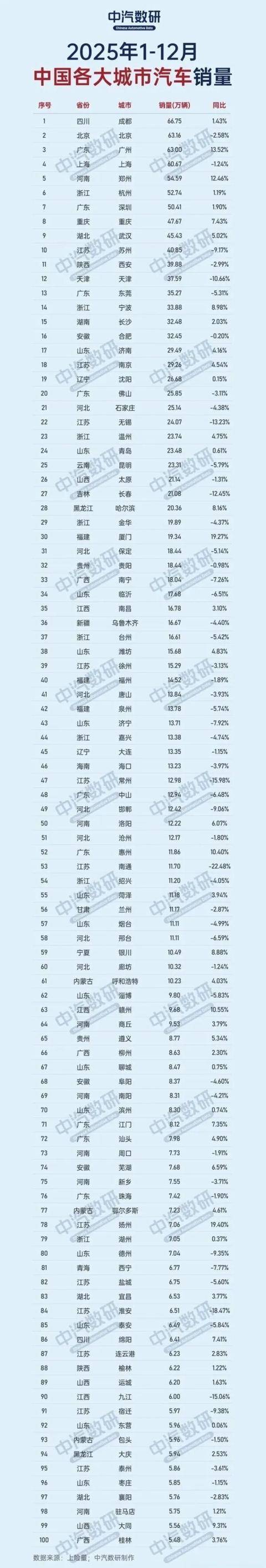 2025年国内乘用车终端市场全年累计销量2,332.4万辆,同比微降0.5%。在全国各城市销量角逐中,成都强势登顶,以66.75万辆的全年销量拿下冠军宝座,同比增长1.43%;作为前三甲中唯一同比下滑的城市,北京全年销量63.16万辆,同比下跌2.58%,这一表现反映出一线城市限购政策及换购周期对市场的压制作用;广州以63.00万辆位居第三,同比增长13.52%,是头部城市中增速最亮眼的选手。