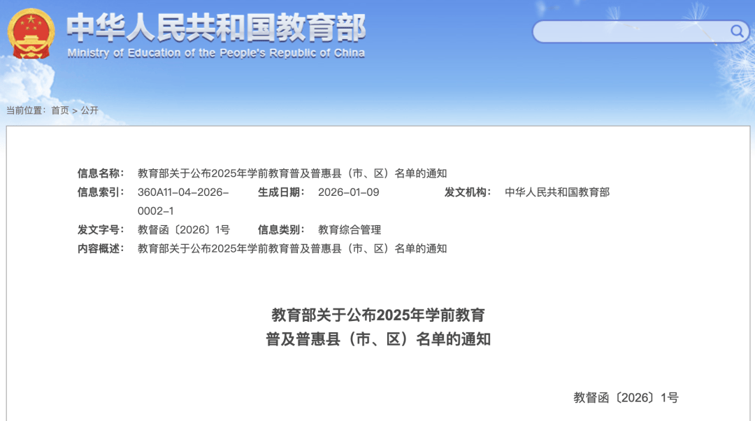 日前,教育部发布《关于公布2025年学前教育普及普惠县(市、区)名单的通知》,公布了2025年427个国家学前教育普及普惠县(市、区)。