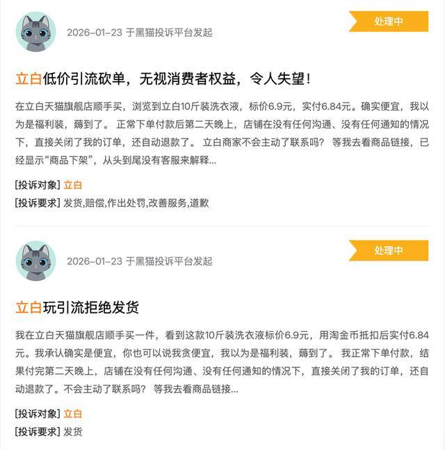 截至目前,立白方面未就订单取消原因进行公开说明。多名消费者表示,未收到针对个人订单的解释,仅收到系统退款通知。