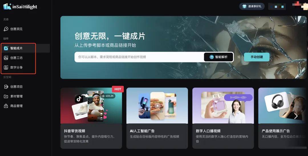 Hilight AI 的官网很简洁,没有复杂的参数,也没有堆砌功能,创作入口主要集中在三个模块:智能成片、数字分身和创意工坊。核心功能则包括一键成片、100% AI 原创 (Zero-Shot)、商品 / 人物跨帧一致性保障、商品与数字人深度融合等。