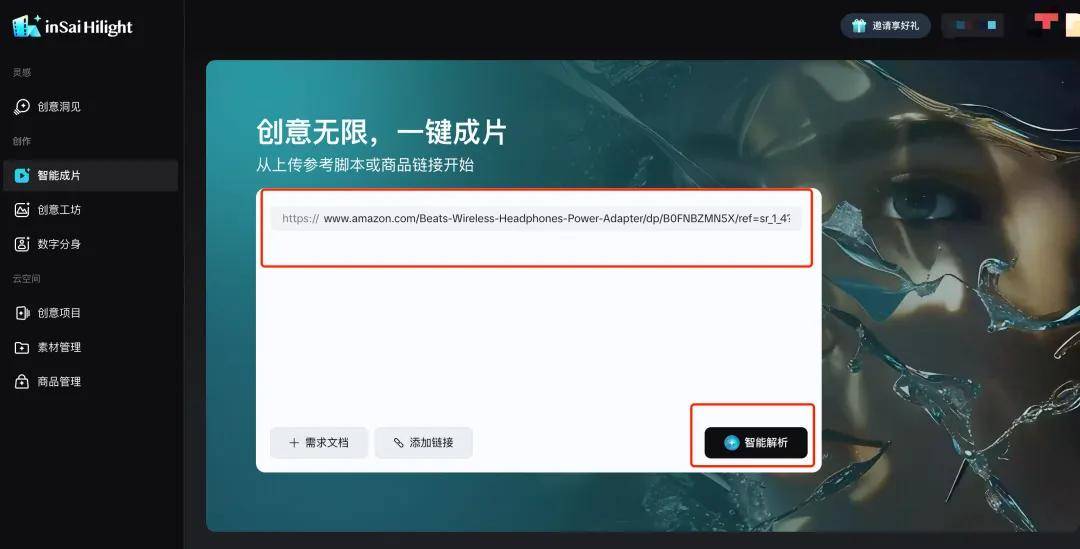 整个过程中,不需要提前准备任何视频素材,只需要提供一个商品链接或商品图片,或是需求描述、脚本等。在这里,我们直接将耳机的链接贴在需求栏,点击智能解析,系统便自动开始工作。
