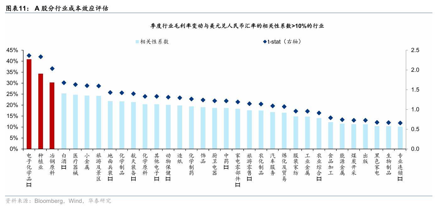成本效应:人民币升值,购买力增强,进口原材料和部件的本币成本下降,对外依存度较高的行业毛利率改善,如电子化学品、种业、冶钢原料等。