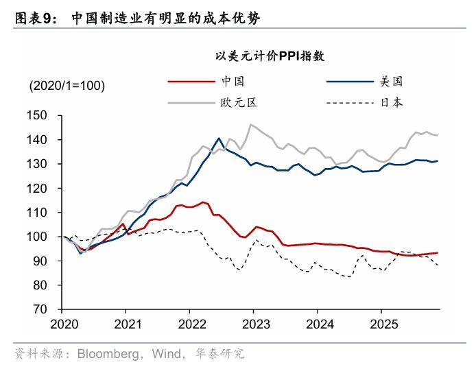 投资者的一点疑问在于:新旧动能转换期的下半场,净出口是拉动经济增长的主要引擎,而一般认为,本币的升值会损害出口企业的竞争力,历史规律是否仍然适用?我们认为,与日本不同,中国之所以能够在在部分新兴制造行业的全球供应链中占据主导地位,并不得益于强竞争力的货币,而得益于极强的产品竞争力、关键资源掌控力(降低贸易摩擦风险)以及中国企业出海拉动的需求。以成本优势为例,2020 年来,美元计价中国 PPI 累计涨幅比美国低约40pp、比欧洲低约50pp。因此,本轮人民币的温和升值并不会损害中国出口企业的竞争力。2026年,除前述两点逻辑外,先进制造、AI等领域的外需高景气可能使得中国的顺差进一步扩大,成为人民币温和升值的动力。