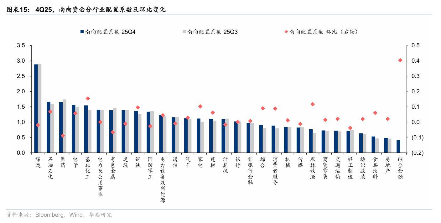 对于行业配置,从资金的流向的角度,无论是A股或是港股,外资偏好的行业在人民币升值期间更可能获得外资净流入,港股需要进一步考虑南向偏好的行业的资金净流出风险。从4Q25北向资金的分行业持仓看,外资资金的审美是与时俱进的,当前显著超配的行业主要集中在中国在全球具备强竞争力的中游制造板块,配置系数居前的前5大行业为白电、电池、工程机械、电网设备、饮料乳品,更可能受益于外资潜在的净流入。从4Q25南向资金的分行业持仓看,目前显著超配的前三大行业为煤炭、石油石化和医药,从资金视角,可能需要适度规避。