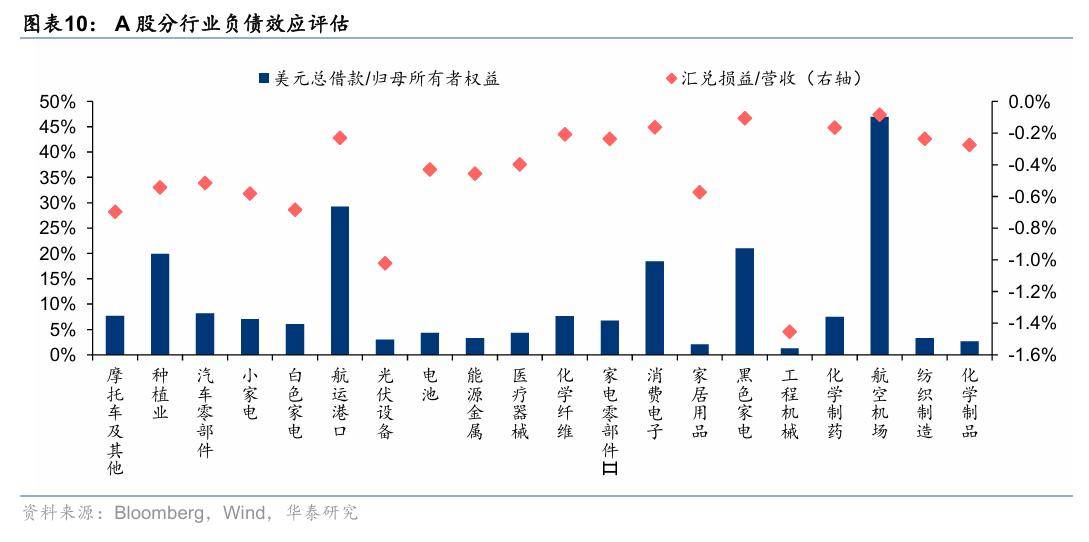 负债效应:人民币趋势性升值对应美元有息债务的减压,同时产生汇兑收益,增厚当期盈利,美元总借款占净资产比重高、汇兑收益占营业收入比重高的行业更受益,如摩托车、种业、汽零、工程机械、光伏设备等。