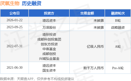 证券之星消息,根据天眼查APP于1月22日公布的信息整理,四川厌氧生物科技有限责任公司B轮融资,融资额未披露,参与投资的机构包括道远资本。