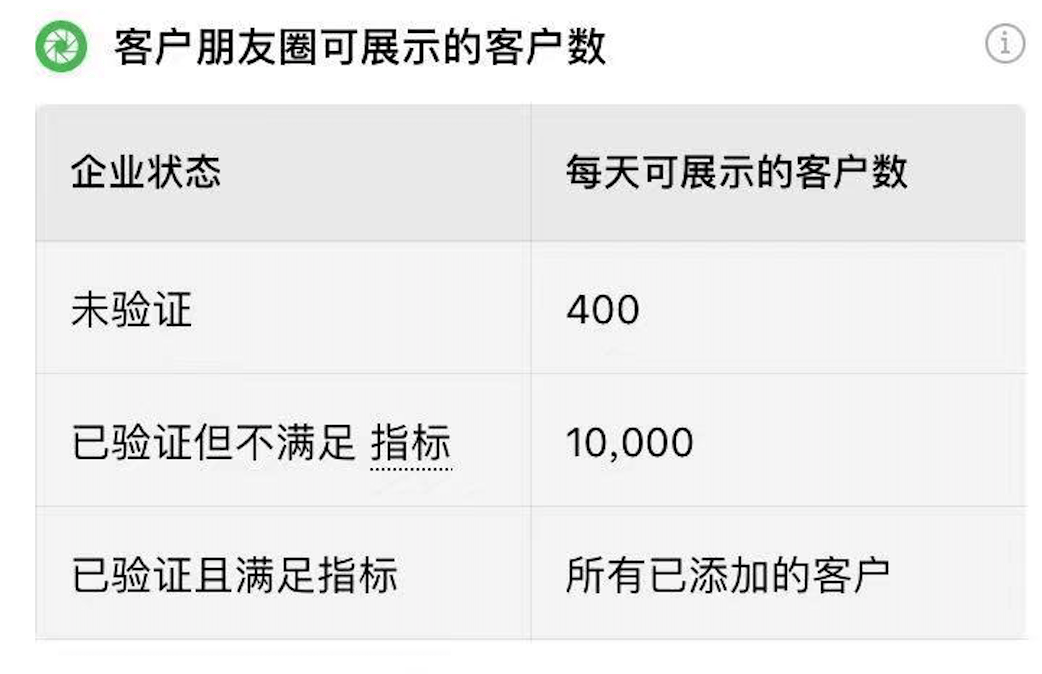 企业微信分目前对于客户朋友圈的人数暂无影响,未验证企业每天可展示客户数 400,已认证但未满足 50 员工活跃的指标,企业每天可展示客户数 10000,已验证且满足活跃指标的,企业每天可展示给全部已添加的客户。
