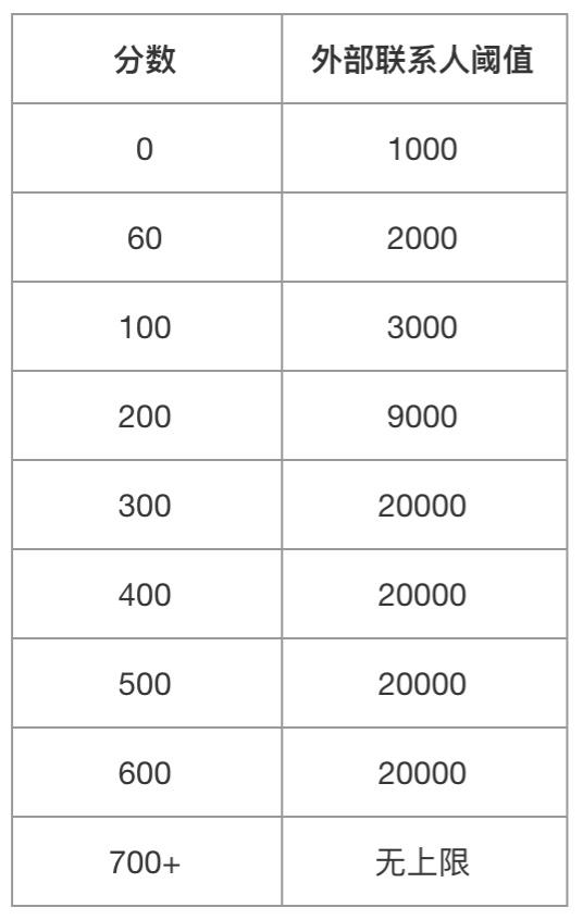 企业微信分,是企业使用企业微信的活跃度的数字化展现,是企业微信鼓励企业长期健康地使用企业微信所推出的一项功能;企业微信分高的企业,能获得更多企业微信的使用权限和额度,被灰度到新功能等,跟芝麻信用分类似,分数越高,权益越大。 对于分数高的企业,可以有用更多添加外部联系人的额度,比如 60分可以添加 2000 外部联系人,400分可以添加20000外部联系人,700+分可以无限制添加外部联系人。但也不是绝对的,每个企业的情况都不一样,有一些之前使用很久的企业微信,250分可以加几十万人。