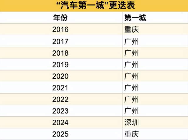重庆重新登顶并不容易。过去几年,国内头部汽车城之间对“汽车第一城”的争夺颇为激烈。近三年这一称号已三易其主,广州霸榜多年也因转型阵痛被深圳赶超,而生产地的统计口径调整又让重庆超越深圳登顶。同时,在细分的新能源赛道,上海、西安、合肥等城市也在“新能源汽车第一城”头衔上你追我赶,凶猛竞逐。
