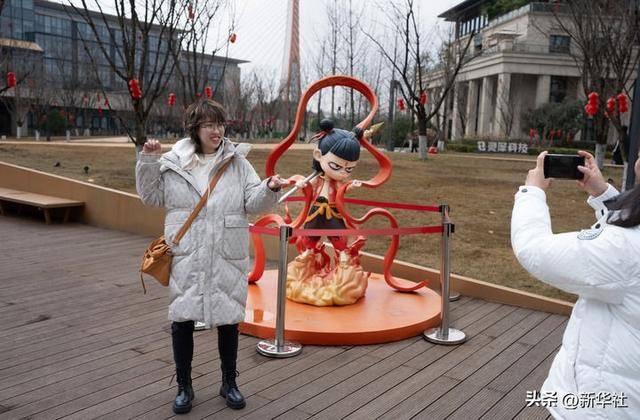 2025年2月8日,影迷在成都天府长岛数字文创园哪吒形象雕塑前合影。新华社记者 江宏景 摄