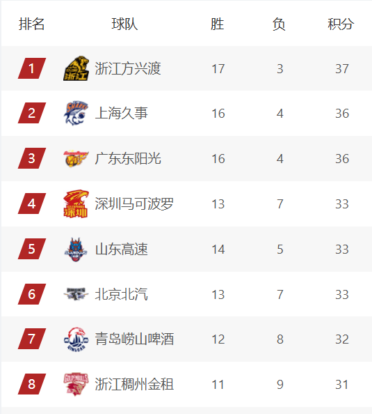 积分榜第5名则是山东队,这一轮比赛他们在主场以24分大胜宁波队,收获一波4连胜,成功将战绩提升到14胜5负,尽管球队还少赛一轮,不过,山东队还是排在积分榜第五名。而第6名则是北京队,他们的战绩为13胜7负。排在第7名的是青岛队,这一轮比赛他们输球之后,球队的战绩变成12胜8负,目前,青岛队已经遭遇4连败,球队排名也从当初的前四名,下滑到积分榜第7。积分榜第8名则是浙江队,他们的战绩为11胜9负。