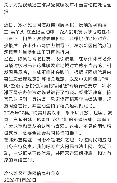 1月26日,湖南永州冷水滩区网信办发布通报称:近日,接网民举报,反映短视频播主“某丫头”在直播互动中,受人挑唆发表涉地域性不当言论,相关内容被录屏传播,涉嫌挑动地域对立。接报后,在永州市网信办指导下,冷水滩区网信办迅速核查并当场制止了其直播行为。