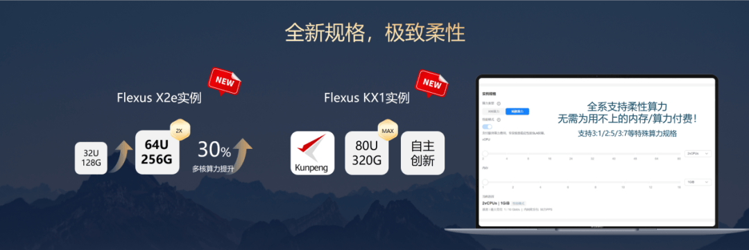 跟应用级优化同步进行的是,实例规模的进一步扩展 。新一代 Flexus X2e 实例的 x86 规格从原本的 32U128G 提升至 64U256G,多核算力提升了约 30%;新增 Flexus KX1 鲲鹏实例,最高可达 80U320G,以覆盖大数据处理、内存数据库这类资源密集型场景。这意味着应用加速机制不再受中小规格环境约束,能在规模更大的资源池里发挥作用。