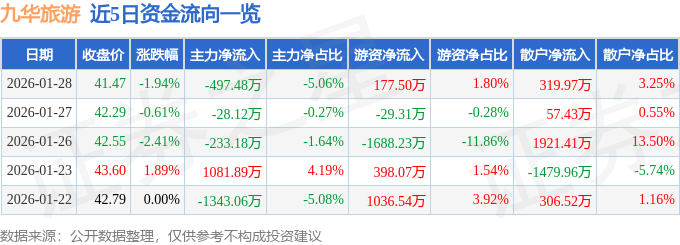 证券之星消息,截至2026年1月28日收盘,九华旅游(603199)报收于41.47元,下跌1.94%,换手率2.13%,成交量2.36万手,成交额9836.93万元。