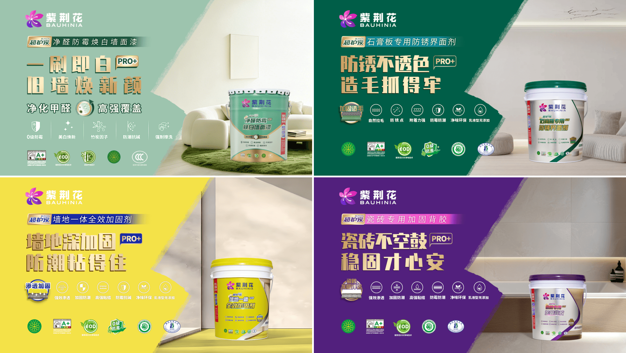 - 分销渠道:紫荆花超护家系列,是紫荆花品牌理念“高性能表现成就健康生活”的集中体现,针对各类家居应用场景的痛点进行产品解决方案的设计,涵盖“超护家净醛防霉焕白墙面漆”、“石膏板专用防锈界面剂”、“墙地一体全效加固剂”、“瓷砖专用加固背胶”四款新产品的发布。