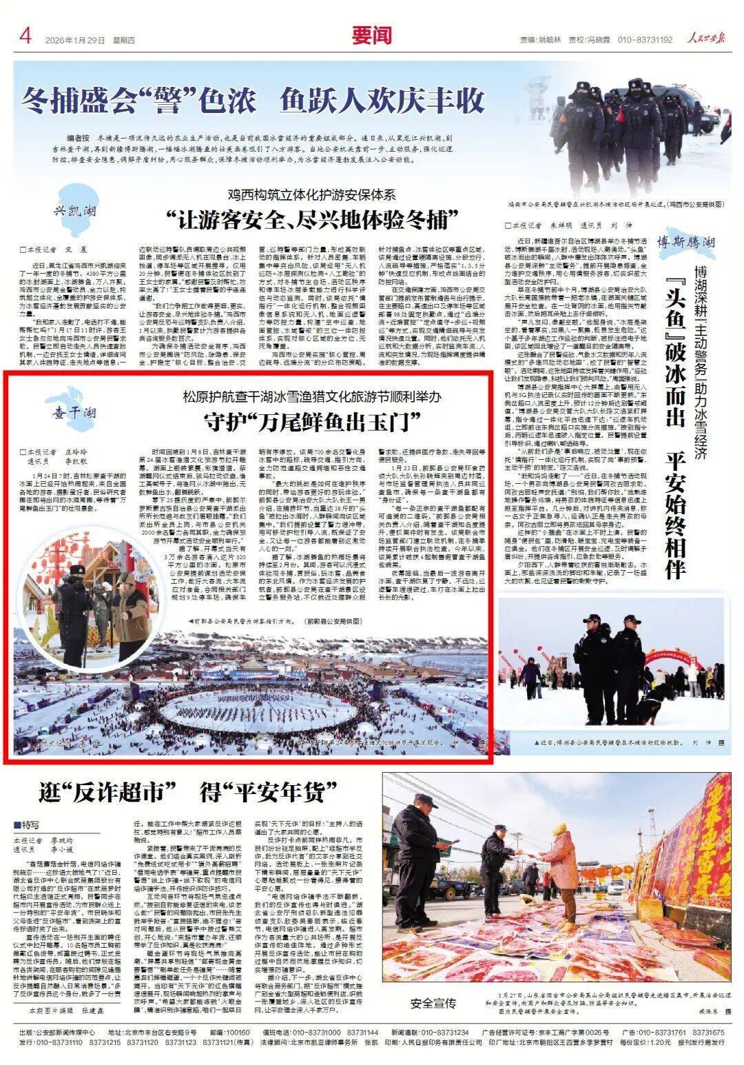 据了解,冰湖腾鱼的热闹场景将持续至2月份。其间,游客可以沉浸式体验观冬捕、赏民俗、玩冰雪、品美食的东北风情。作为冰雪经济发展的护航者,前郭县公安局在查干湖景区设立警务服务站,不仅就近处理群众报警求助,还提供医疗急救、走失寻回等便民服务。