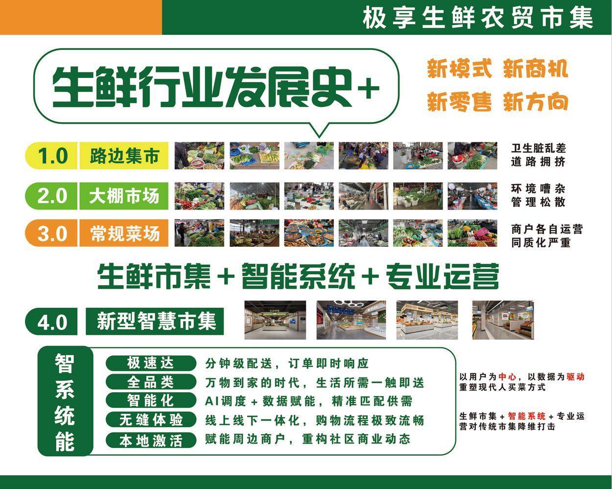 我们打造的是一家集蔬菜、水果、肉类、小吃、熟食、米面粮油、轻餐、茶饮、配套商户的新型智慧市集,致力解决方圆居民的一日三餐生鲜采购需求、提升农贸市场采购体验感和环境舒适度。
