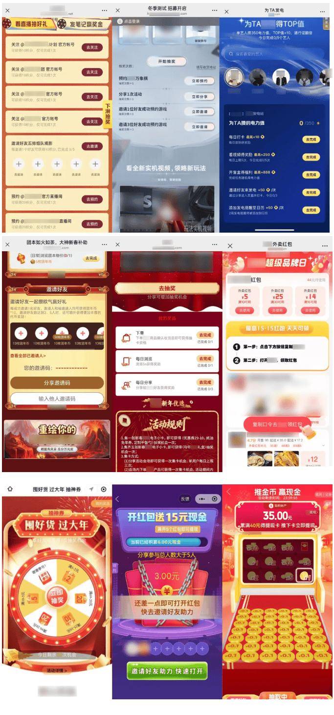 部分第三方通过公众号、小程序、链接等渠道,实施高频次营销推送、强制跳转页面、诱导 / 误导用户分享等行为。例如:以“做任务”“抽奖”“助力”等话术诱导用户频繁分享;通过技术手段强制用户跳转至非目标页面。