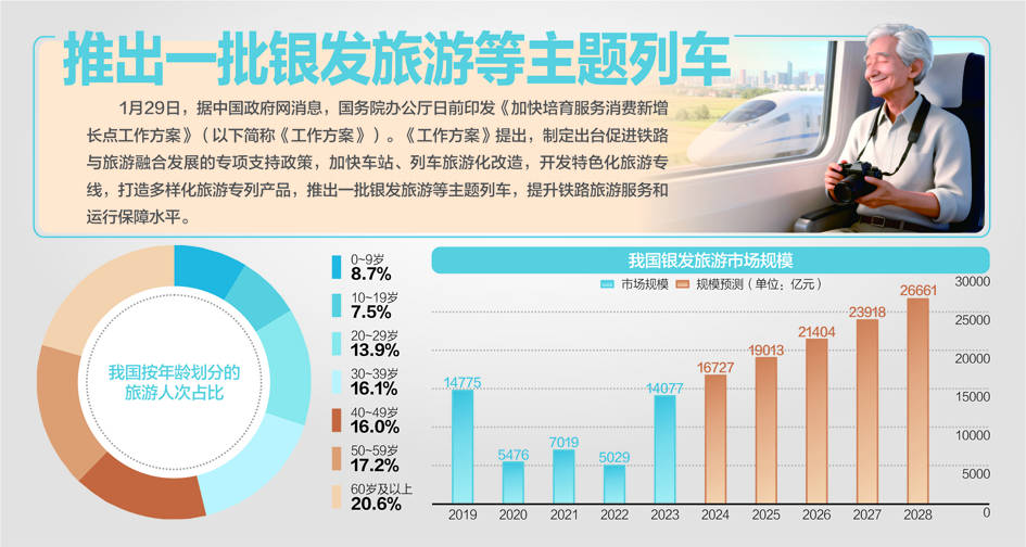 《工作方案》指出,制定出台促进铁路与旅游融合发展的专项支持政策,加快车站、列车旅游化改造,开发特色化旅游专线,打造多样化旅游专列产品,推出一批银发旅游等主题列车,提升铁路旅游服务和运行保障水平。支持有条件的地方开展邮轮消费创新,提升邮轮服务水平,打造融合消费场景,开发沉浸式、多元化邮轮消费产品。